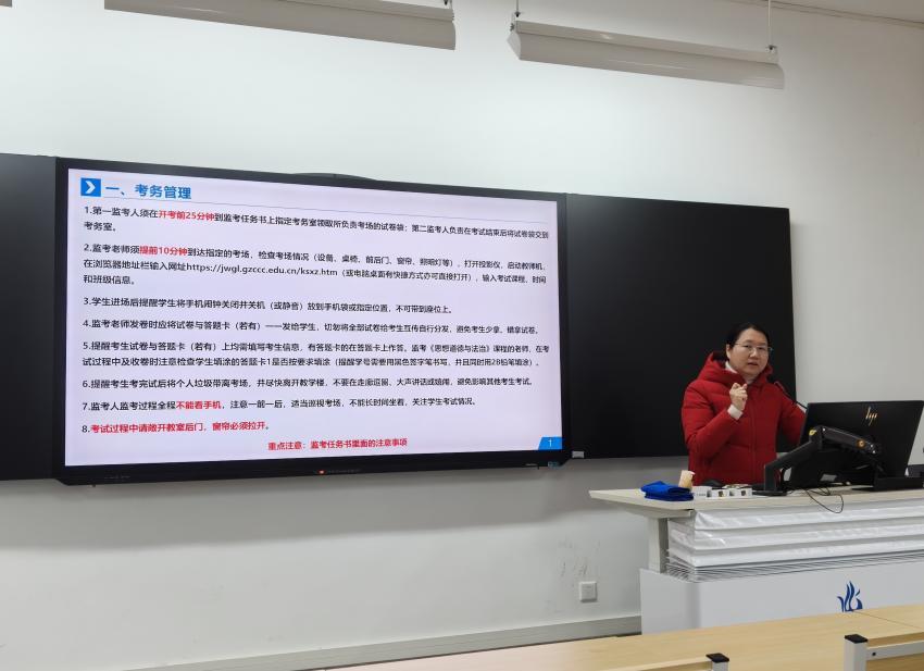 会议伊始,副院长郑永芹首先强调了考风考纪的重要性。她指出,考风是学校教学秩序的直接体现,关系到学生的成长成才与学院的声誉形象。良好的考风有助于确保考试公平公正,引导学生树立正确的学习态度与价值观,从而促进学院形成积极向上的学风。随后,郑副院长详细介绍了本次期末考试的组织安排。她表示,学院已制定出严谨有序的考试计划,从考试时间、科目编排到考场布置与座位规划,均力求科学合理、公平公正。