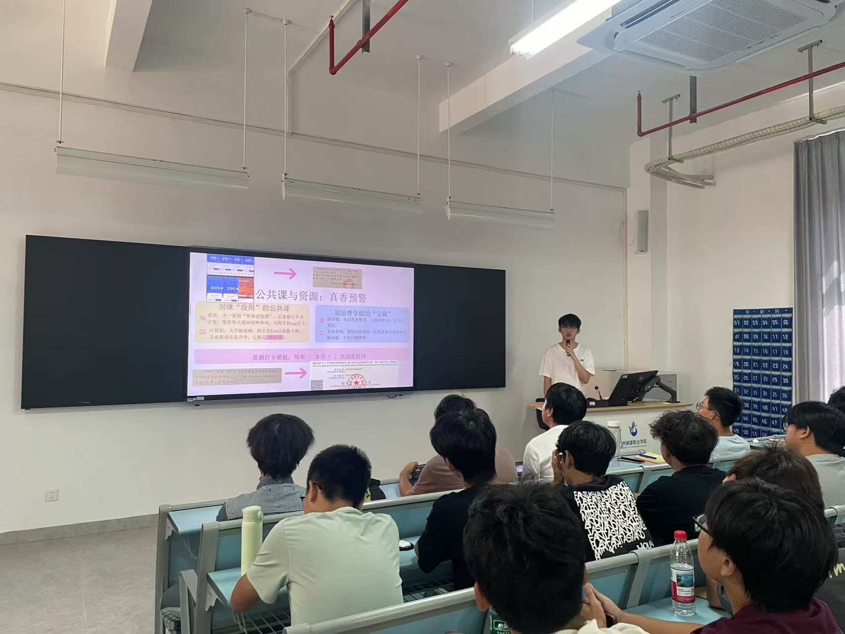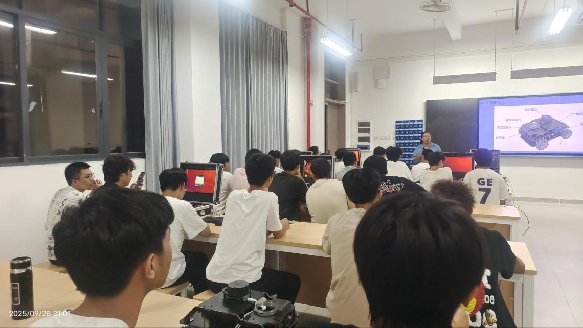 榜样的力量是无穷的,在2025年广东省大学生计算机视觉大赛的“AI视觉应用创新挑战赛(本科组)”中荣获一等奖的团队成员黄阿茵学姐、刘少博学长亲临现场,分享其“人员跌倒检测系统”的开发心得与参赛历程。“从大一的懵懂好奇,到如今的赛场夺奖,是学院提供的优质平台和老师的悉心指导,让我们不断成长。希望学弟学妹们珍惜资源,勇于尝试和试错,在机器人领域找到属于自己的热爱与方向。”寄语学弟学妹们注重动手实践。梁家轩学长则从学习方法、竞赛避坑等实用角度,为新生提供参考。黄学姐的寄语与梁学长关于学习方法的分享,赢得了现场阵阵掌声,极大地激发了新生的学习热情。