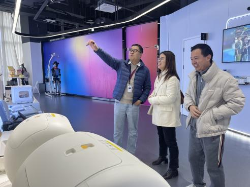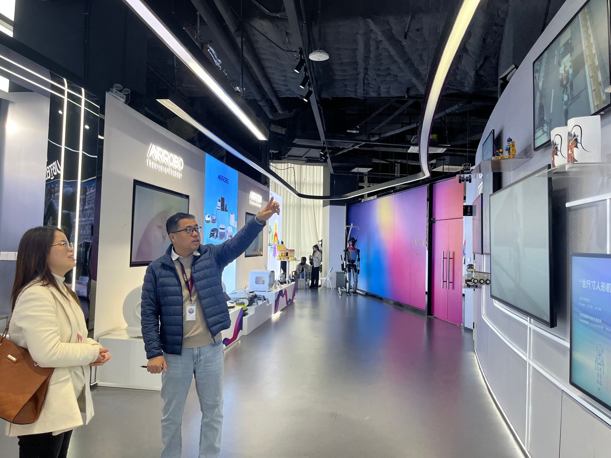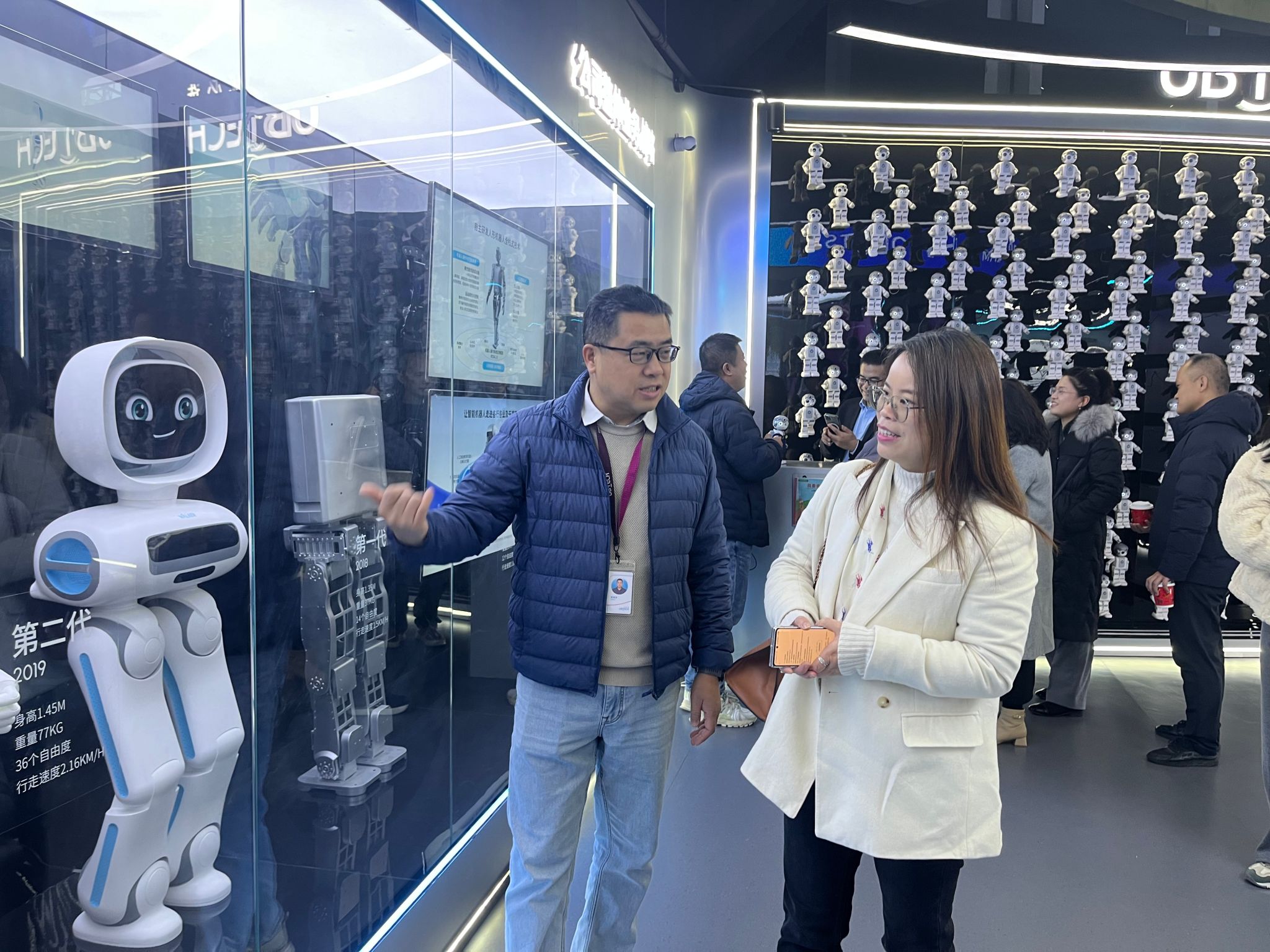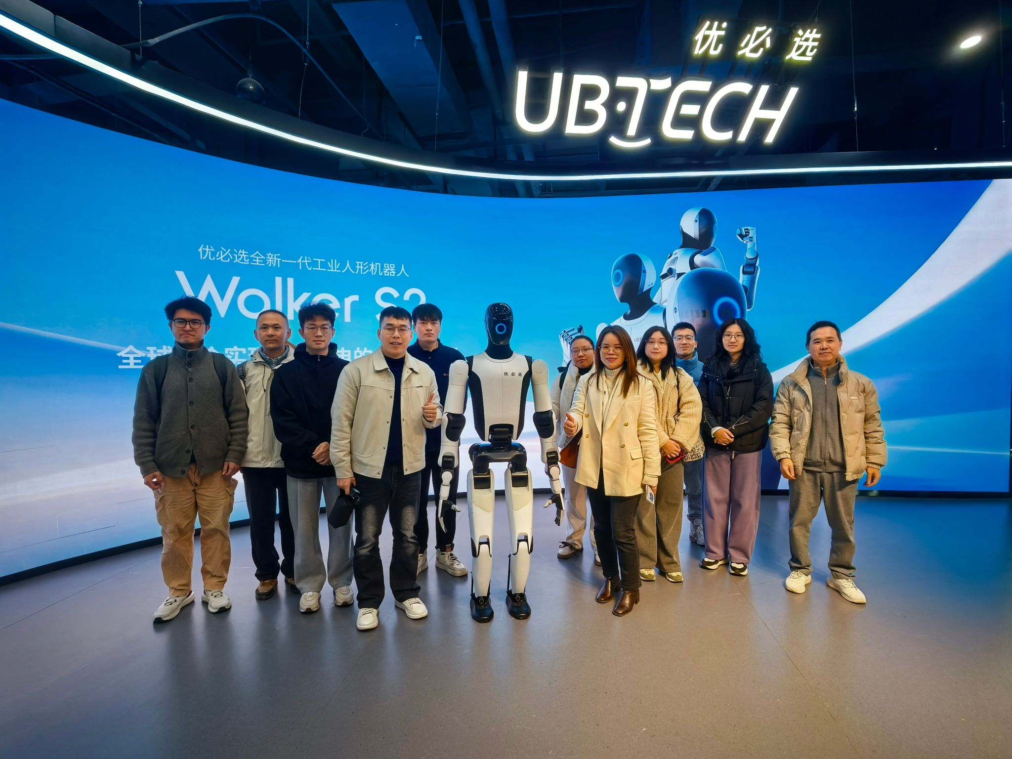 活动伊始,优必选公司业务市场总监李伟光热情接待我院代表团,并陪同参观企业展厅,展厅内,团队深入了解了优必选在人形机器人、服务机器人、工业机器人及AI教育等领域的创新成果。作为全球首家登陆A股的“人形机器人第一股”,优必选不仅市值稳步攀升、市场表现强劲,更在核心技术研发、多场景规模化落地和产业生态构建方面走在世界前列。其自主研发的全尺寸人形机器人已成功应用于汽车制造、智慧物流、康养服务及未来城市等多个高价值场景,并多次登上央视春晚等国家级舞台,充分彰显了其深厚的技术积淀、强大的品牌影响力,以及国家对具身智能这一战略性新兴产业的高度认可。