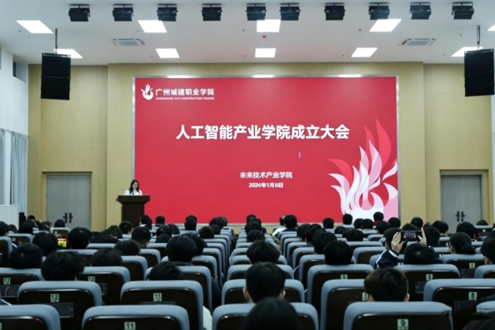2026年1月6日晚,广州城建职业学院未来技术应用学院在清远校区图书馆414报告厅,联合广东能飞等多家企业,与腾讯联合腾科举行人工智能产业学院成立大会。学院院长潘丹主持大会,学校副校长杨清国出席并致辞。腾讯云计算(北京)有限责任公司产业生态南区商务总监谌龙、广州腾科网络技术有限公司总经理唐慧、深圳创想未来机器人有限公司解决方案总监蔡俊、广东能飞航空科技发展有限公司校企部总监何泳欣、北京卓翼智能科技有限公司广东运营中心总经理等多家企业高层代表,与学院领导班子、教研室负责人及骨干教师等200多名学子齐聚一堂,共同见证产业学院的成立,并围绕“人工智能+智能机器人+智能产品开发+无人机+产业场景”人才培养路径展开深度交流。