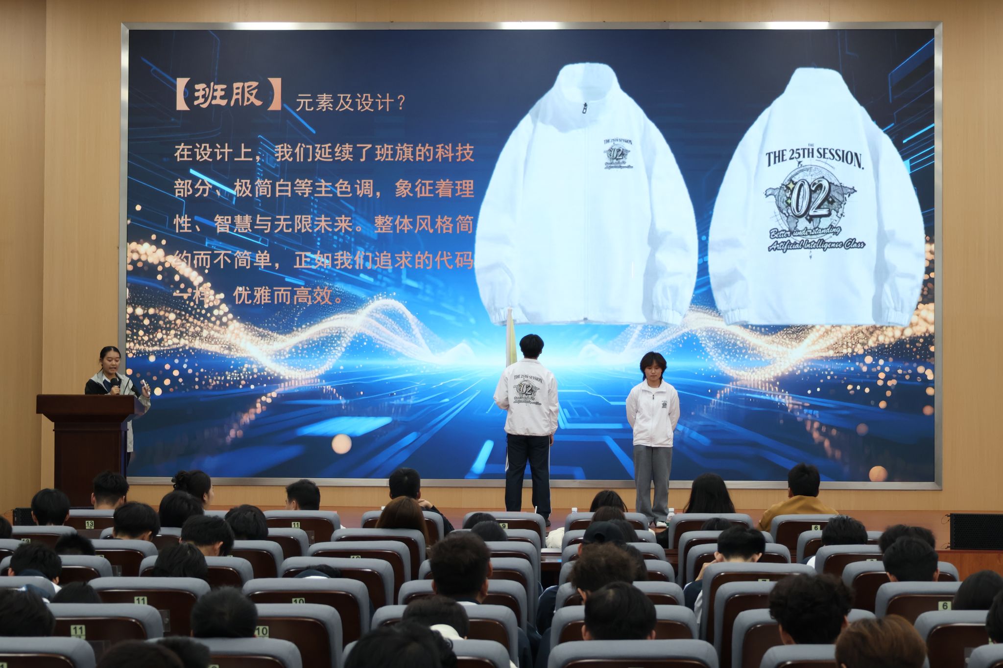 比赛过程中,各参赛班级依次通过“设计理念阐述”与“实物展示”两个环节,生动而全面地呈现了融合专业特色与班级精神的设计作品。每个班级都充分发挥创意,结合所学专业知识,将独特的班级文化与精神内涵融入设计之中,既展示了扎实的专业功底,也体现了团队协作与创新思维。作品不仅具有鲜明的学科特点,更传递出积极向上的集体价值观,充分展现了各班同学的创造力与凝聚力。
